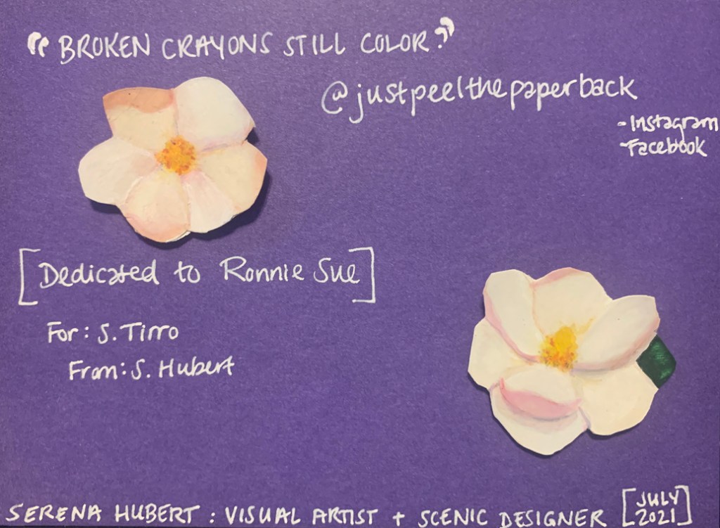 I am proud and grateful to Serena for being such an important part in the completion of What Ronnie Sue Knew. This is our first book cover design, and I hope it’s just the beginning of a significant part of her career as an artist. Someday, people will know her name. She can be found on Instagram and Facebook @justpeelthepaperback.