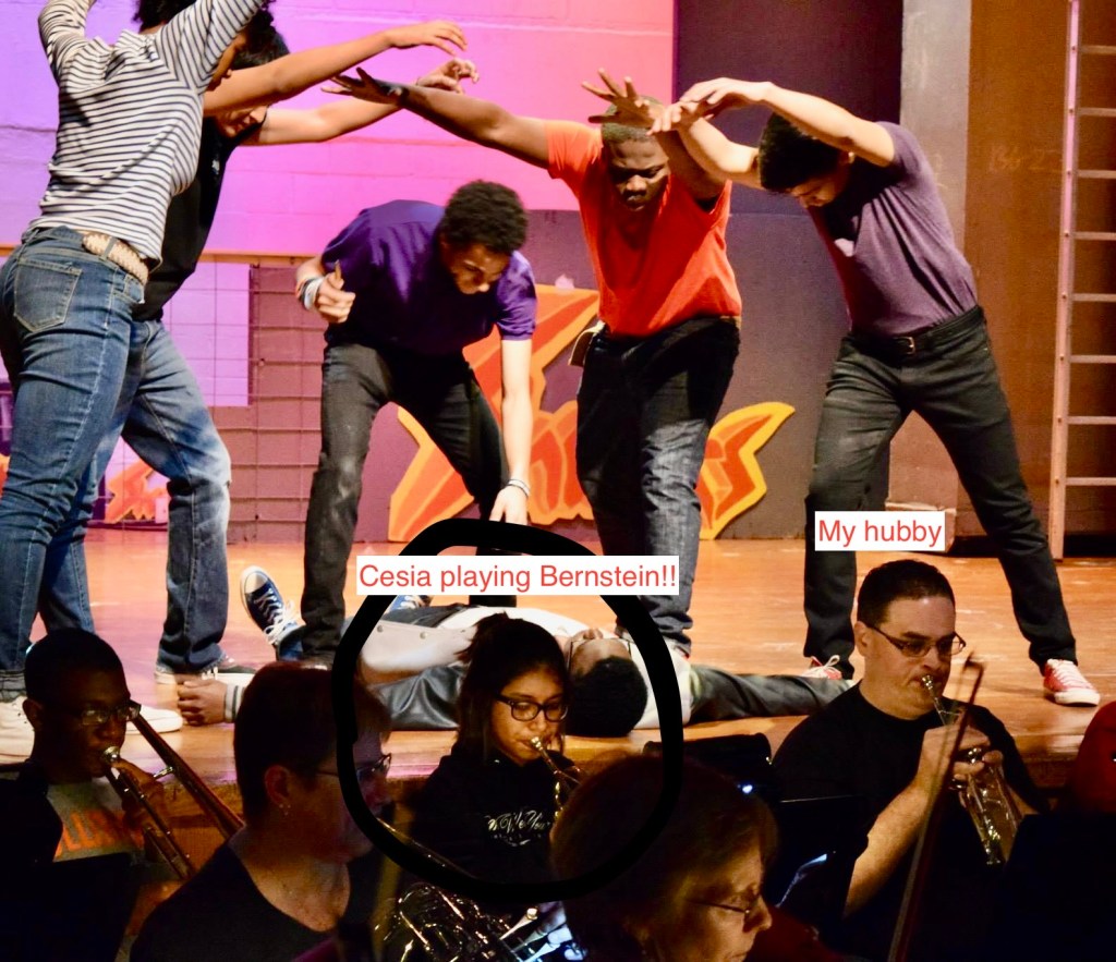 Cesia recalls how some of the projects we worked on were quite intimidating to her as a young musician. During her sophomore year, we tackled West Side Story and she was playing trumpet in the pit orchestra. She sat next to my husband, who we recruited as one of many adult ringers to help fill out the instrumentation for Bernstein’s monster score. I remember my husband thinking the score was intimidating – I can only imagine how young Cesia felt at 15. I would look to my side and think ‘oh, one day, I’m going to play just like him! ‘ Through the fear, she was inspired to see all of the adults who came to support the production because they showed the students how you can carry your passion for your craft far beyond high school.