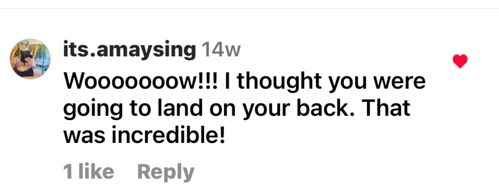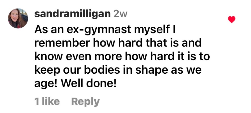 Then, things got kicked up a notch. Months ago, I got creative and posted a video compilation titled “Moments from the Geriatric Gymnast.” I found an existing motivational audio on Instagram and I was playing with putting my video stuff over it.