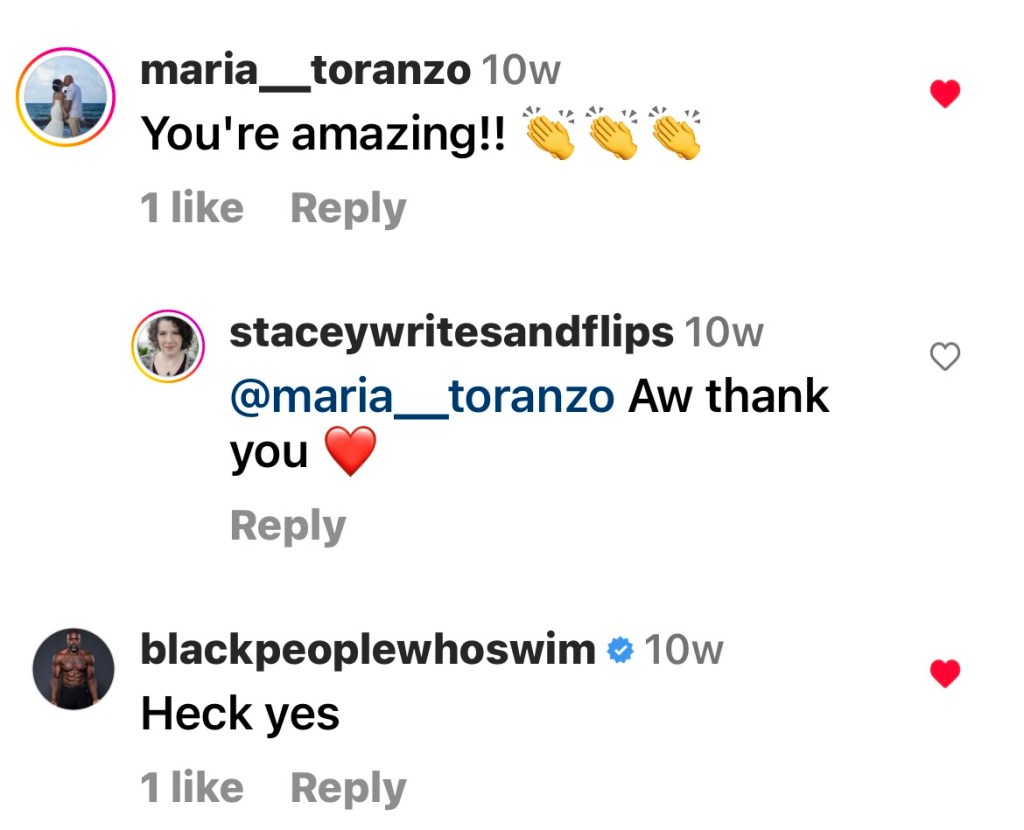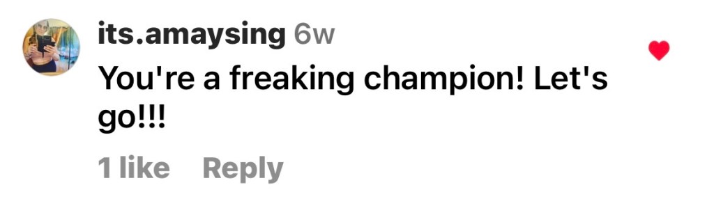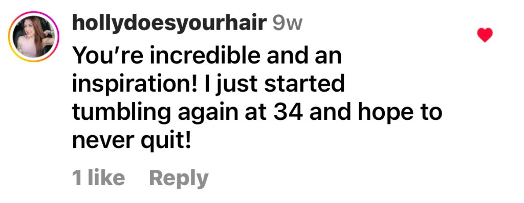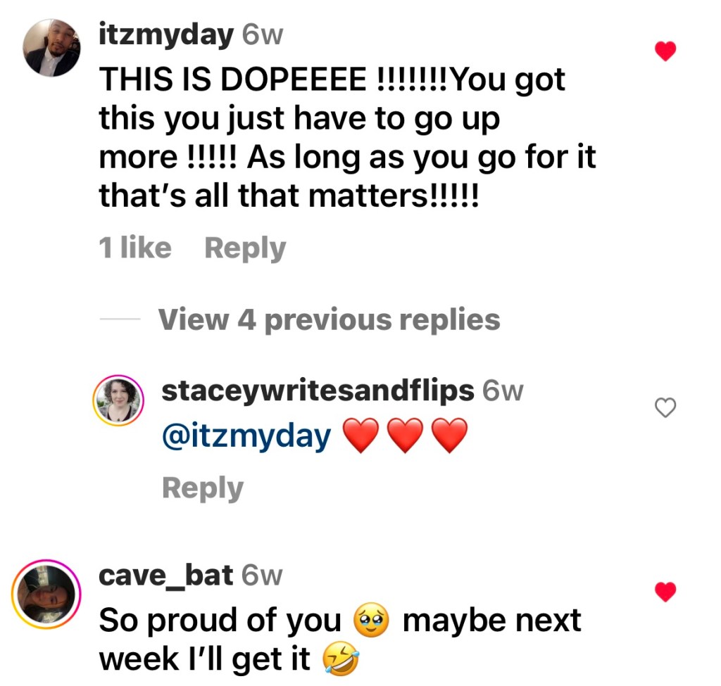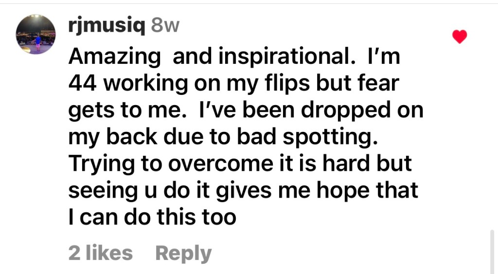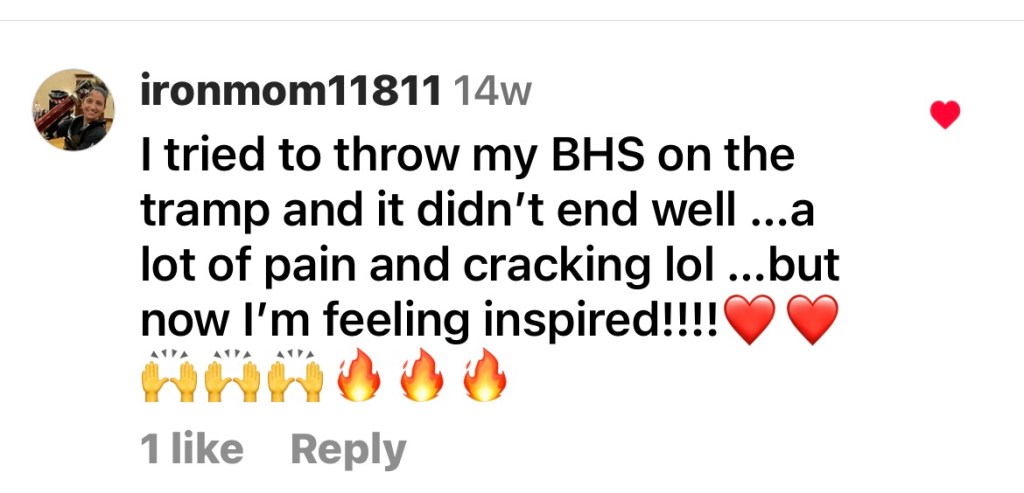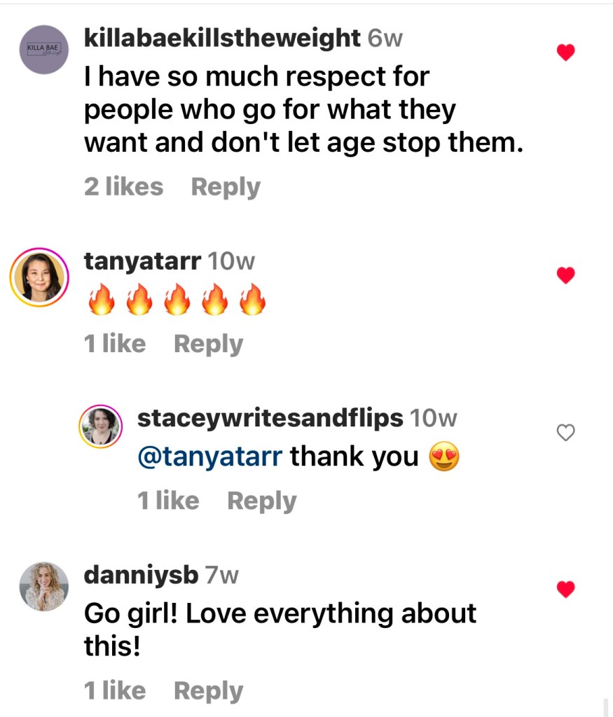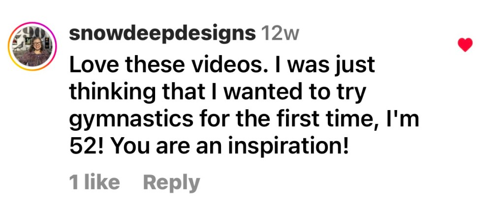 As it circulated, more people had things to say. Below are some of the comments I’ve enjoyed reading from random people, strangers, who took the time to let me know that what I was posting was being enjoyed and was leading people to seek out their own next steps in their fitness journey. Just like children need role models, adults need to see themselves (through others like them) doing things that they have put aside because of time, money, family, physical limitations; all of the reasons that we decide NOT to do things in life.