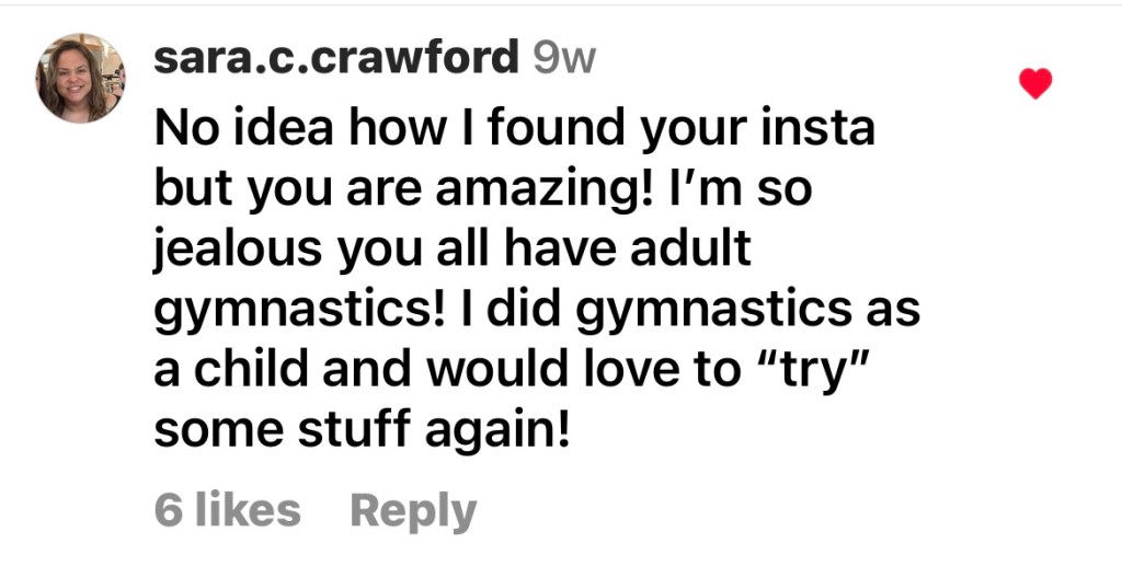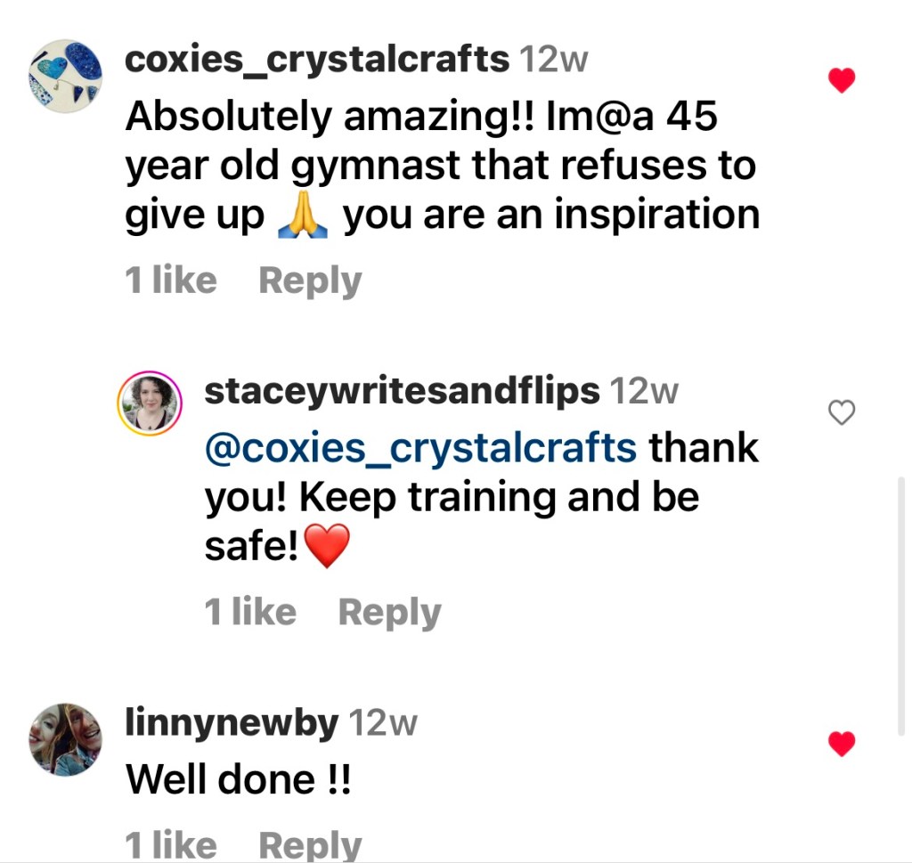 I started this journey at 36 and have not looked back. I’ve been injured, I’ve been frustrated, I’ve had setbacks, and I’ve enjoyed every moment I’ve spent in the gym. Every setback was followed by lots of progress. I’ve learned so much about myself, how to support others, how to learn and how to coach. Knowing how good it has been for me, I will continue to post and I hope to continue to provide to model how adult gymnastics can provide safe, flippy fun.