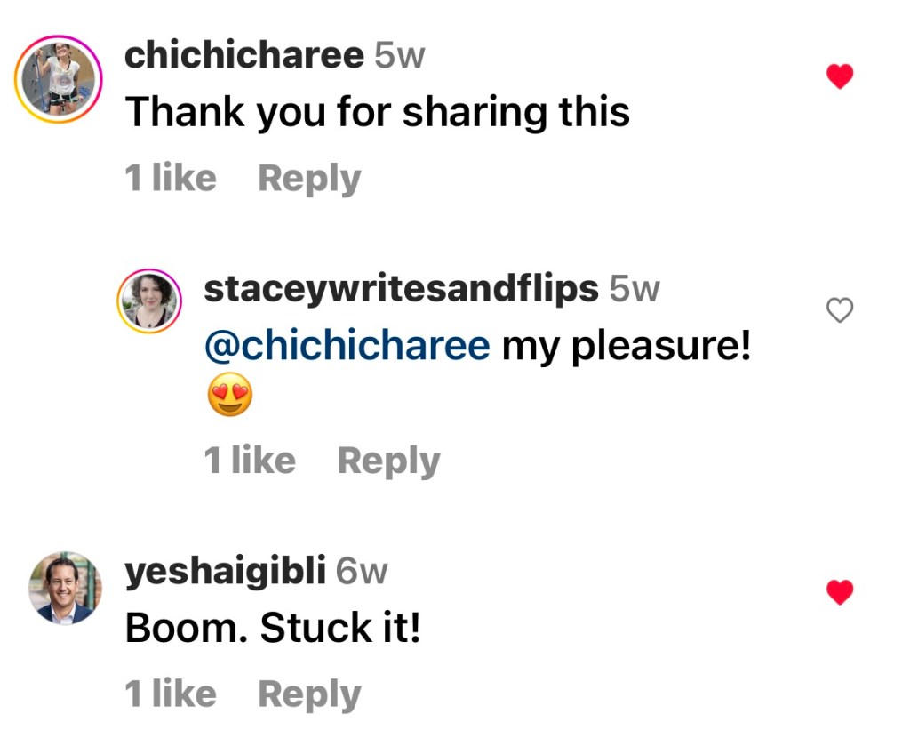 - INSTAGRAM (staceywritesandflips): Of course, if you’re of the IG set, click on @Staceywritesandflips to stay connected to it all.