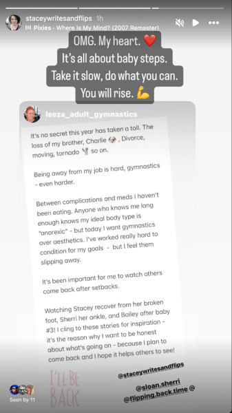 One Saturday morning, I was tagged in a seemingly random IG story. Someone, a real person who posts her flippy stuff in the IG universe, has been struggling a great deal for a long time. She’s also an adult gymnast who, for many big reasons, has recently been suffering major set back by a whole lot of life. I read her story over and over, and my heart just swelled.
