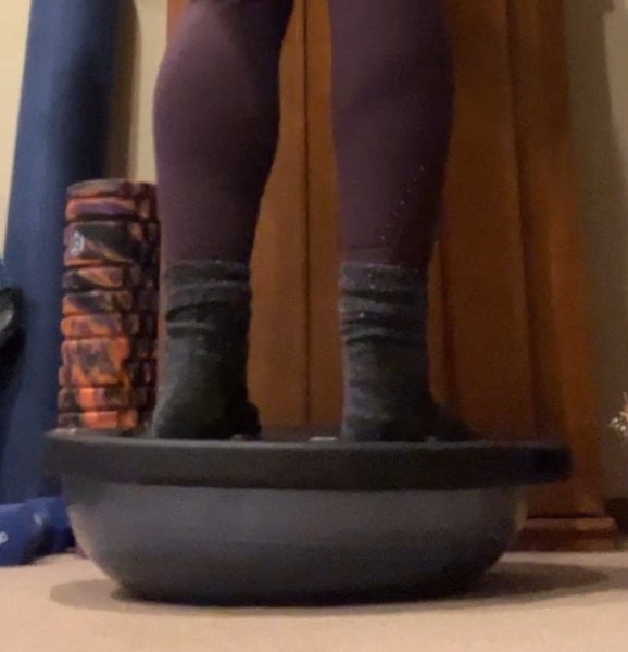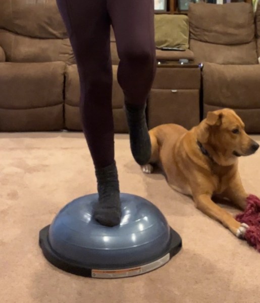 BOSU ball balance: On the flat side with two feet. I wobble in different directions to challenge my stability muscles. I also have something to hold onto, in case I wobble too much.