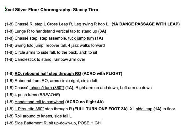 For the floor routine, I fell back on my experience as a choreographer. I opened a Google Doc and started listing the skills I could do that were in the NAIGC requirements.